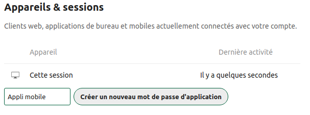 (3) Dans Appareils & sessions, indique un nom d'application et clique sur Créer :